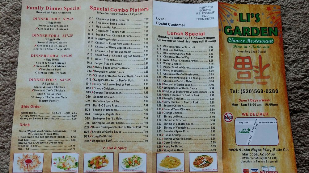 Welcome to Li’s Garden, a delightful Chinese eatery nestled in Maricopa, AZ. This charming restaurant offers a menu packed with authentic flavors, all prepared with freshness in mind. Guests rave about signature dishes such as the expertly cooked Teriyaki Chicken and the freshest Fried Rice paired with their homemade chili oil, creating a symphony of taste in every bite.